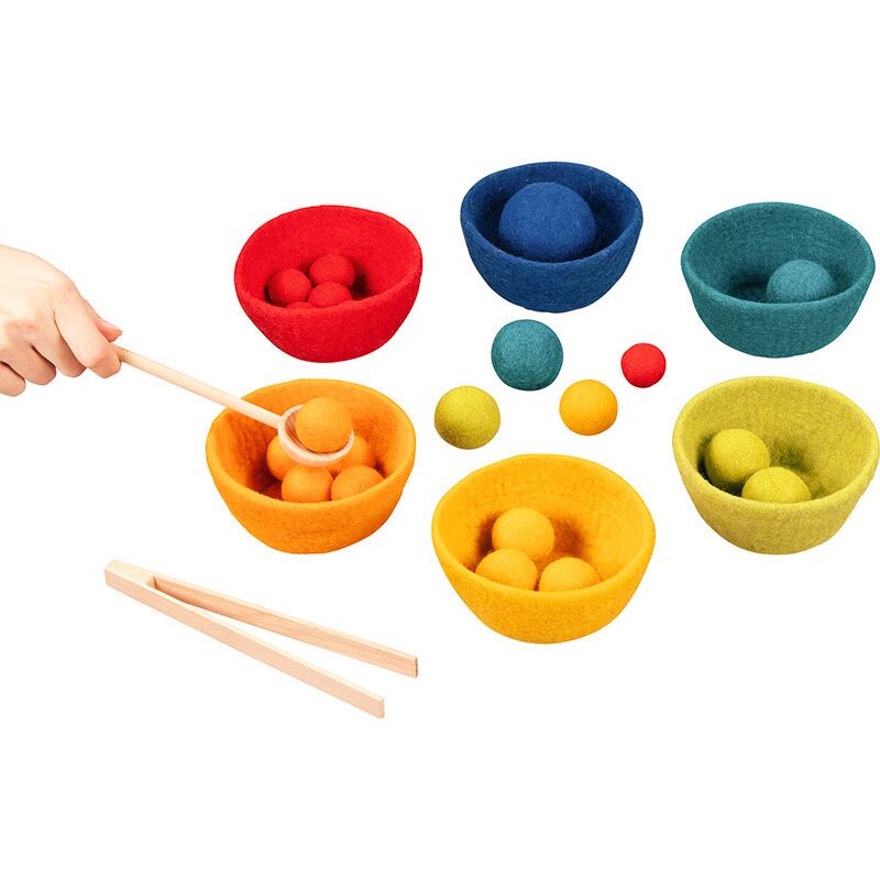 羊毛100%のボール&ボウルが大活躍します。 付属のトングやスプーンで指先遊びをしたり、積み木遊びを彩るアイテムとして使用したり、遊びの幅が広がります。 ボウル6色各1ヶ・ボール6色21ヶ 対象年齢:3才頃〜 大きさ:トング・スプーン20cm/ボウル直径12cm 材質:羊毛 メーカー:ゴキ
