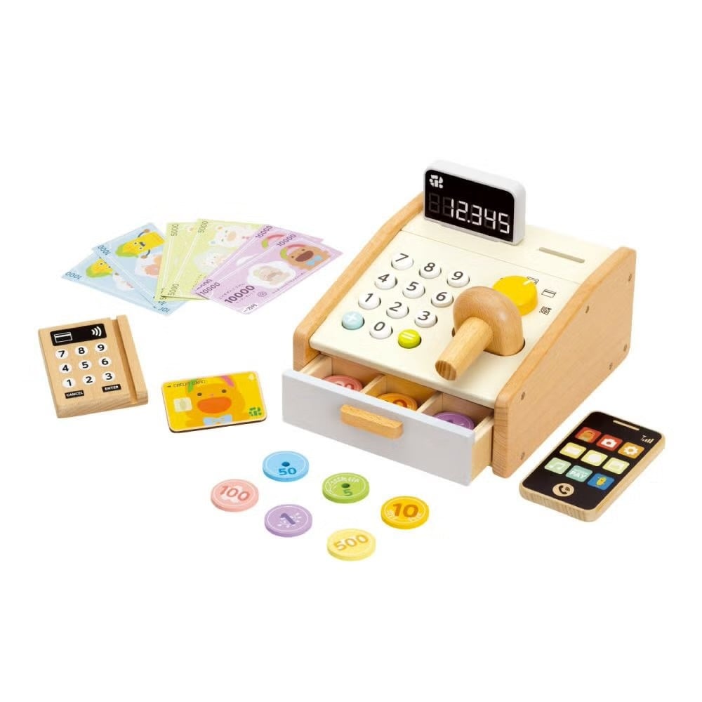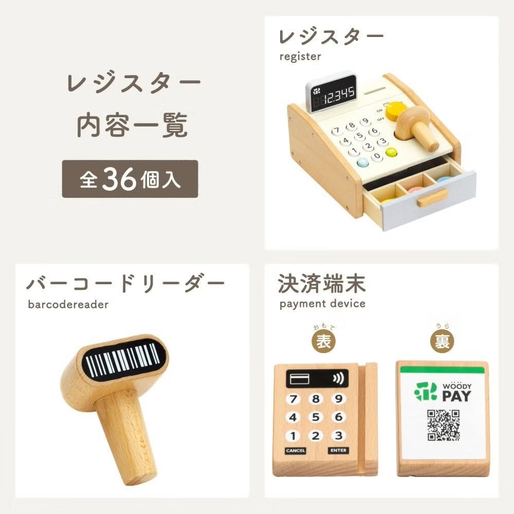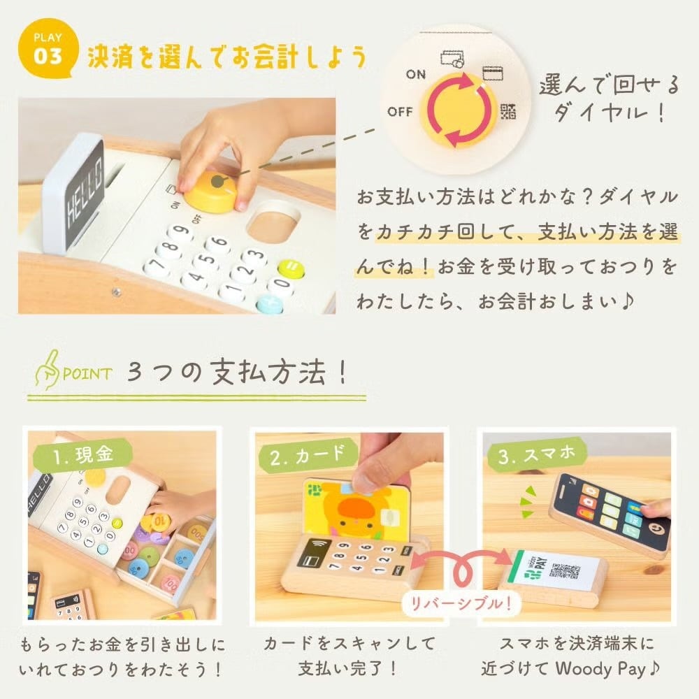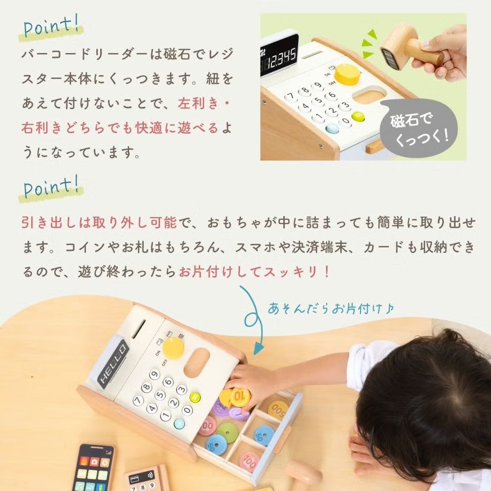 小さな手でボタンを押すたびに、店員さんになりきってお客様を迎えたり、 お会計をする楽しさを体感できます。