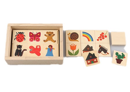 ボードを手元に持って、同じ絵柄を見つけてのせたり(1才頃〜)、裏返してカードををめくり、自分のボードの絵と合うか比べて遊べます(3才頃〜)。